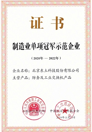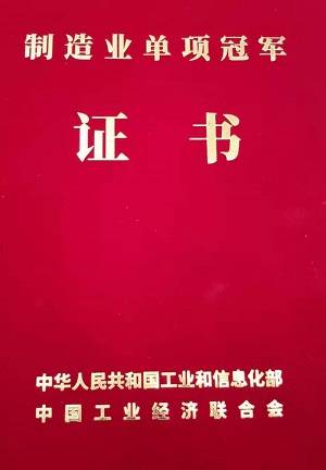 2019年11月27日,获得工业和信息化部第四批制造业单项冠军企业(产品)