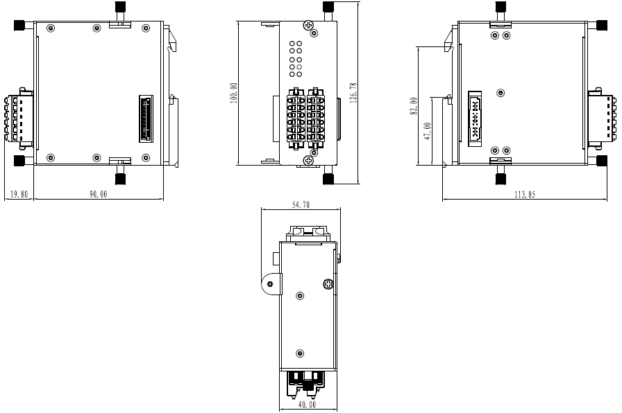 | 机械结构 | 机械结构 铝质外壳 防护等级 IP20 尺寸 40mm x 100mm x 90mm (W x H x D) 整机重量 500g 安装方式 导轨安装 |