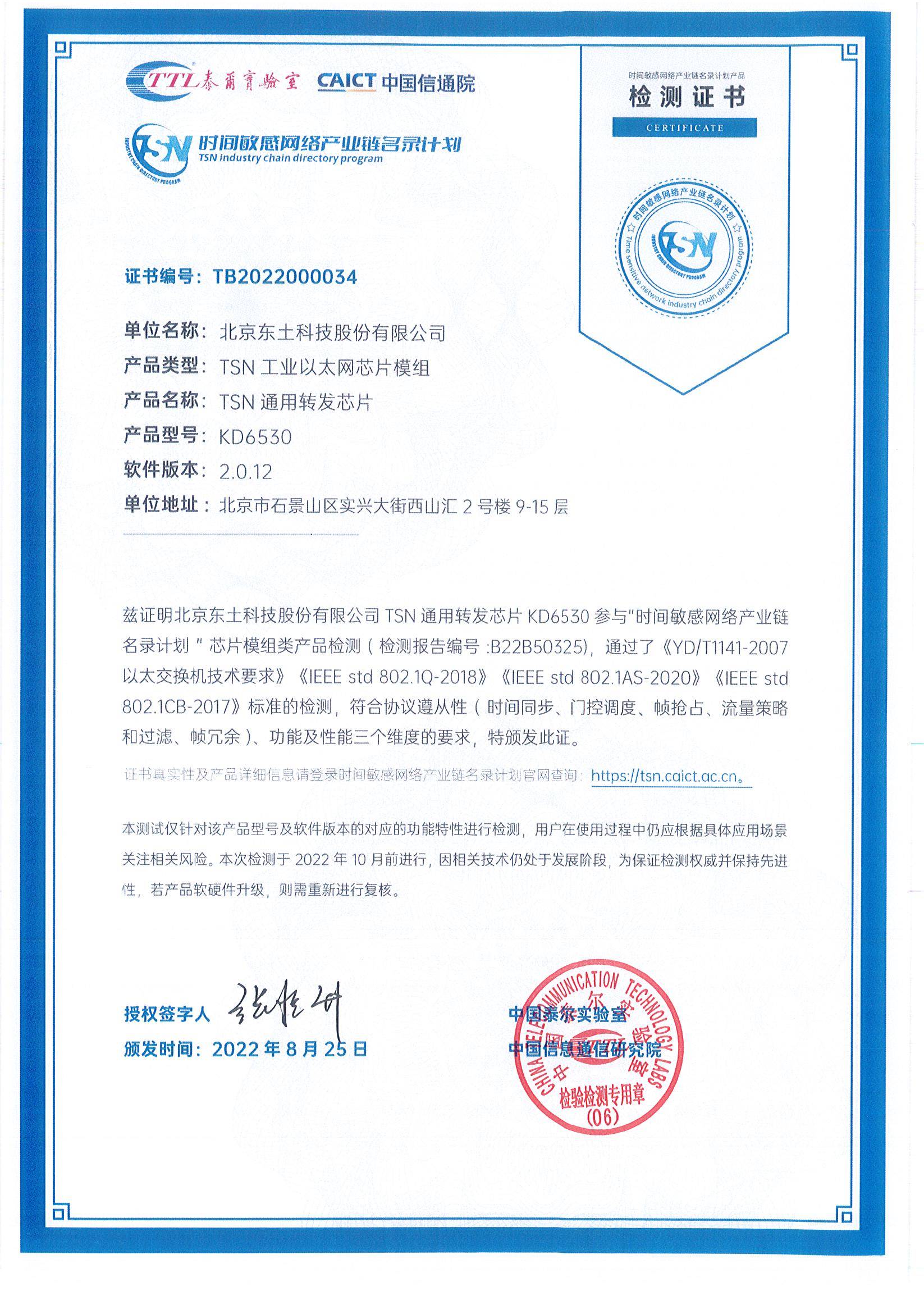 KD6530芯片是北京2026年澳门今晚开奖号码-澳门今晚开奖结果号码-今晚澳门开奖现场直播-澳门彩今晚开奖结果-澳门天天彩开奖结果-新澳门今晚一肖必中特-25新澳门今晚必开一肖-macaujccom澳门彩官网科技公司发布的国内首款TSN芯片,具备时间同步、流量调度、帧抢占、流量策略及过滤、帧冗余等TSN特性。本次测试对该款芯片的功能、性能以及IEEE 802.1AS、802.1QBV、802.1QBU、802.1QCI、802.1CB等协议一致性进行了全面评测。经评估,KD6530芯片正式加入时间敏感网络(TSN)产业链名录,取得芯片模组类证书。