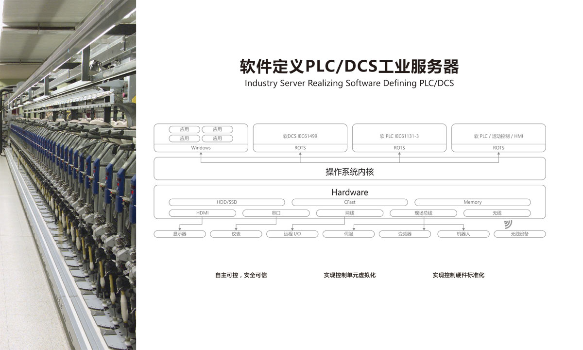 工业服务器采用了自主可控的现场高实时操作系统内核和创新的现场宽带工业总线芯片,以互联互通和IPV6技术实现一网到底,将状态感知、传感器采集、现场控制与工业网络一体化融合,通过将PLC/DCS等传统控制系统软化实现对工业流程的软件定义。将极大的精简传统的控制网络结构,降低工业现场系统的总成本,提高工业现场的部署效率。