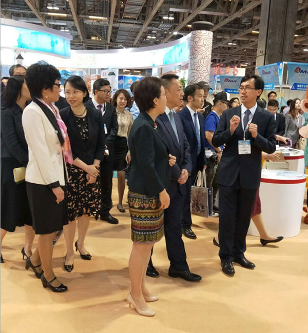 石景山副区长周西松带领澳门特区经济财政司司长梁维特、北京市副市长程红等领导参观石景山企业展区
