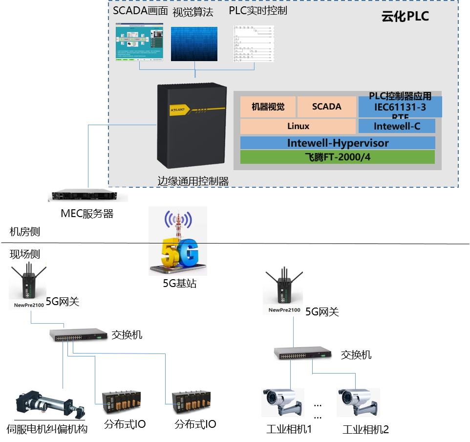 云化控制:引入边缘计算的系统架构,将Intewell工业操作系统、软件定义控制的视觉算法、运动控制整合到MEC平台,将传统工业控制硬件云化为5G MEC边缘云软件系统。