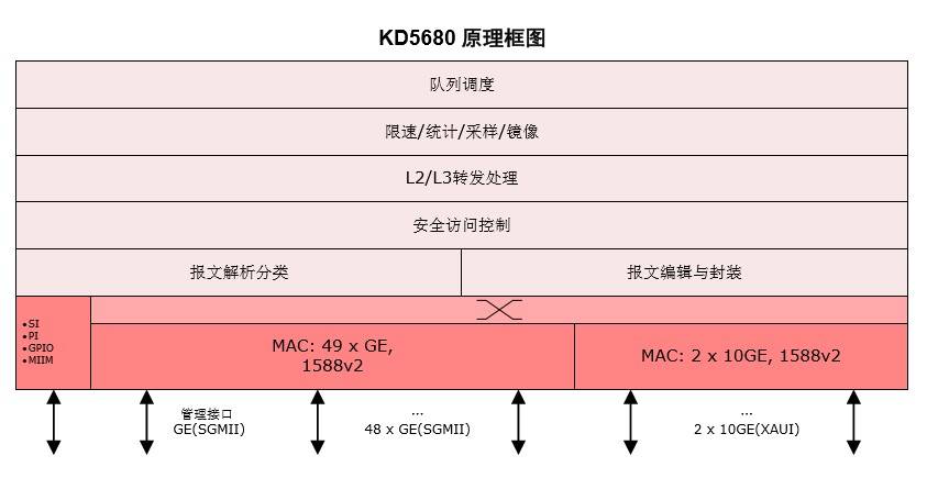 KD5680 包含 48 个 GE 接口、 2 个 10GE 接 口以及 1 个 GE 管理端口,所有网络转发业务均 可在最小 64 字节报文情况下达到 68Gbps 的最 高性能。可支持 L2/L3 交换、IP 单播组播路由、 安全访问控制 ACL 和流量管理功能,并可支持 多样灵活的报文流分类特性以及丰富的管理控制接口。