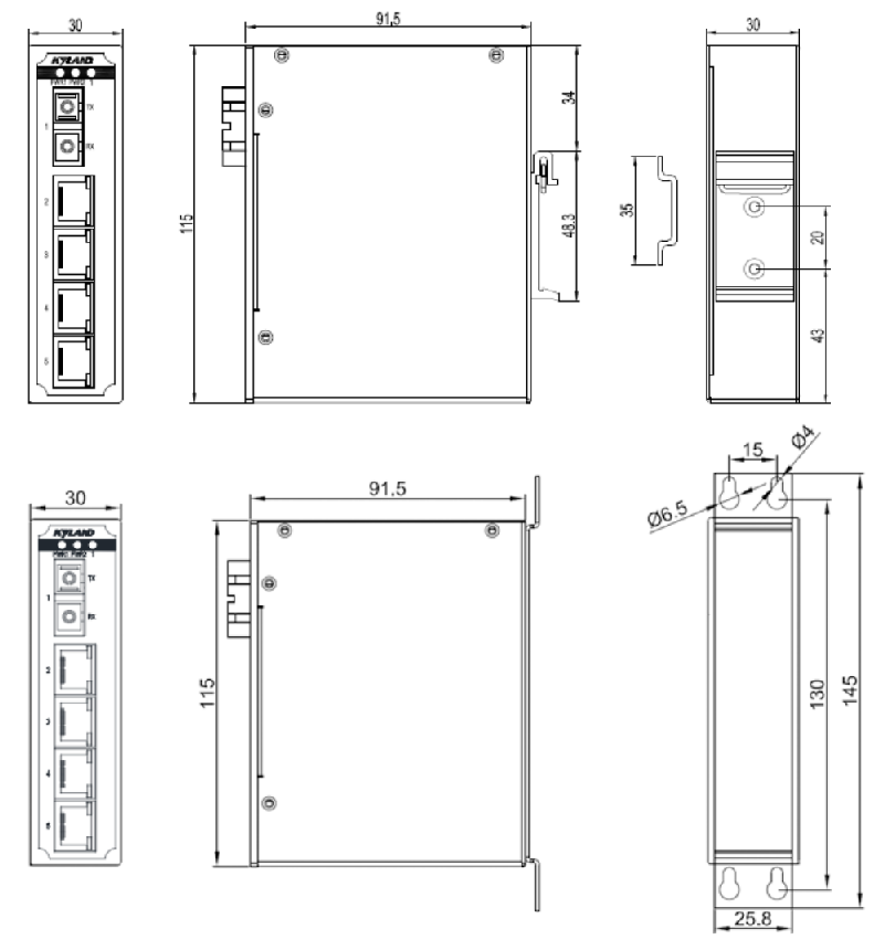 | 机械结构 | 外壳 金属材质 散热方式 自然冷却, 无风扇 防护等级 IP40 尺寸 30mm×115mm×91.5mm (W×H×D) 重量 0.46Kg 安装方式 DIN卡轨式或壁挂式 |