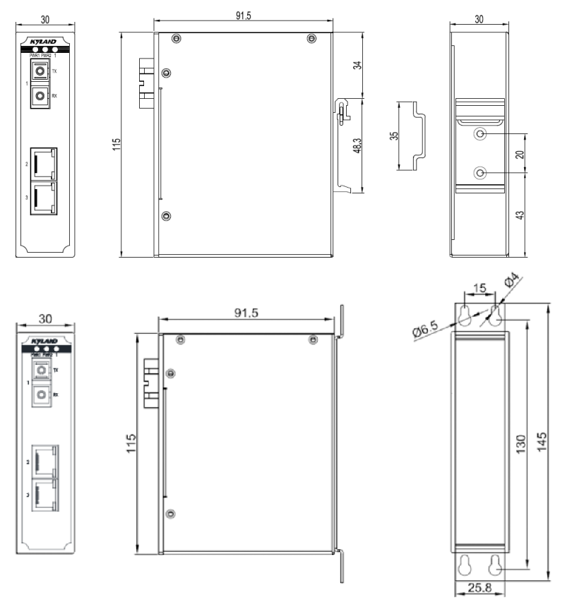 | 机械结构 | 外壳 金属材质 散热方式 自然冷却,无风扇 防护等级 IP40 尺寸 30mm×115mm×91.5mm(W×H×D)(1S2T,1M2T) 31mm×114.5mm×94mm(W×H×D)(1SFP2T) 重量 0.46Kg(1S2T,1M2T) 0.3Kg(1SFP2T) 安装方式 DIN卡轨式或壁挂式 |
