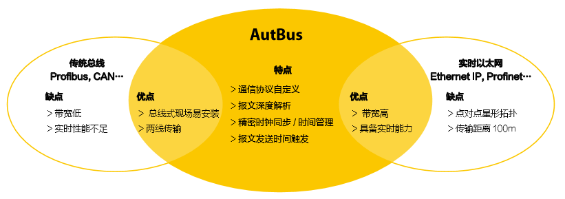 AUTBUS 是一种采用两线非桥接媒介,具有多节点、高带宽、高实时、可 远距离传输的工业现场总线。总线数据带宽达到 100Mbps,最大传输距离 500 米,最小循环周期 8 微秒,最大节点数 256 个,传输误码率优于 10-11,总线 时钟抖动 10ns,同时支持总线虚拟化和非对称加密。AUTBUS 用于过程控制和离散控制等自动化控制工业现场的实时数据和非实时数据的传输与应用,兼容 ISO/IEC/IEEE 8802-3 以太网、IPv6 等应用。