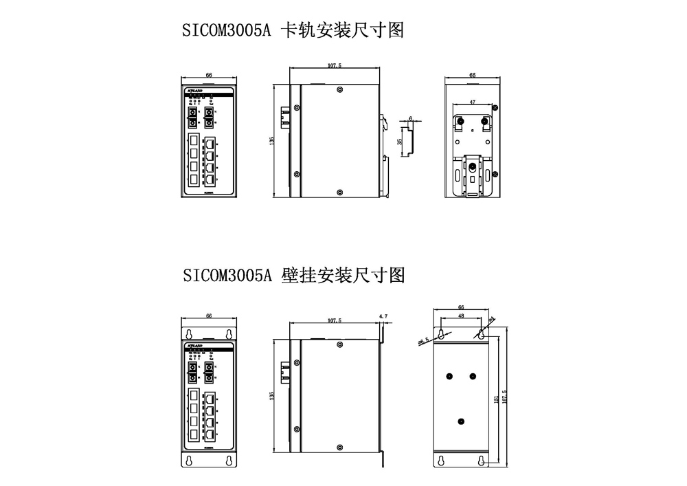 | 机械结构 | 外壳 金属材质 散热方式 自然冷却,无风扇 防护等级 IP40 尺寸 66mm×135mm×107.5mm(W×H×D) 重量 0.6Kg 安装方式 DIN卡轨式或壁挂式 |